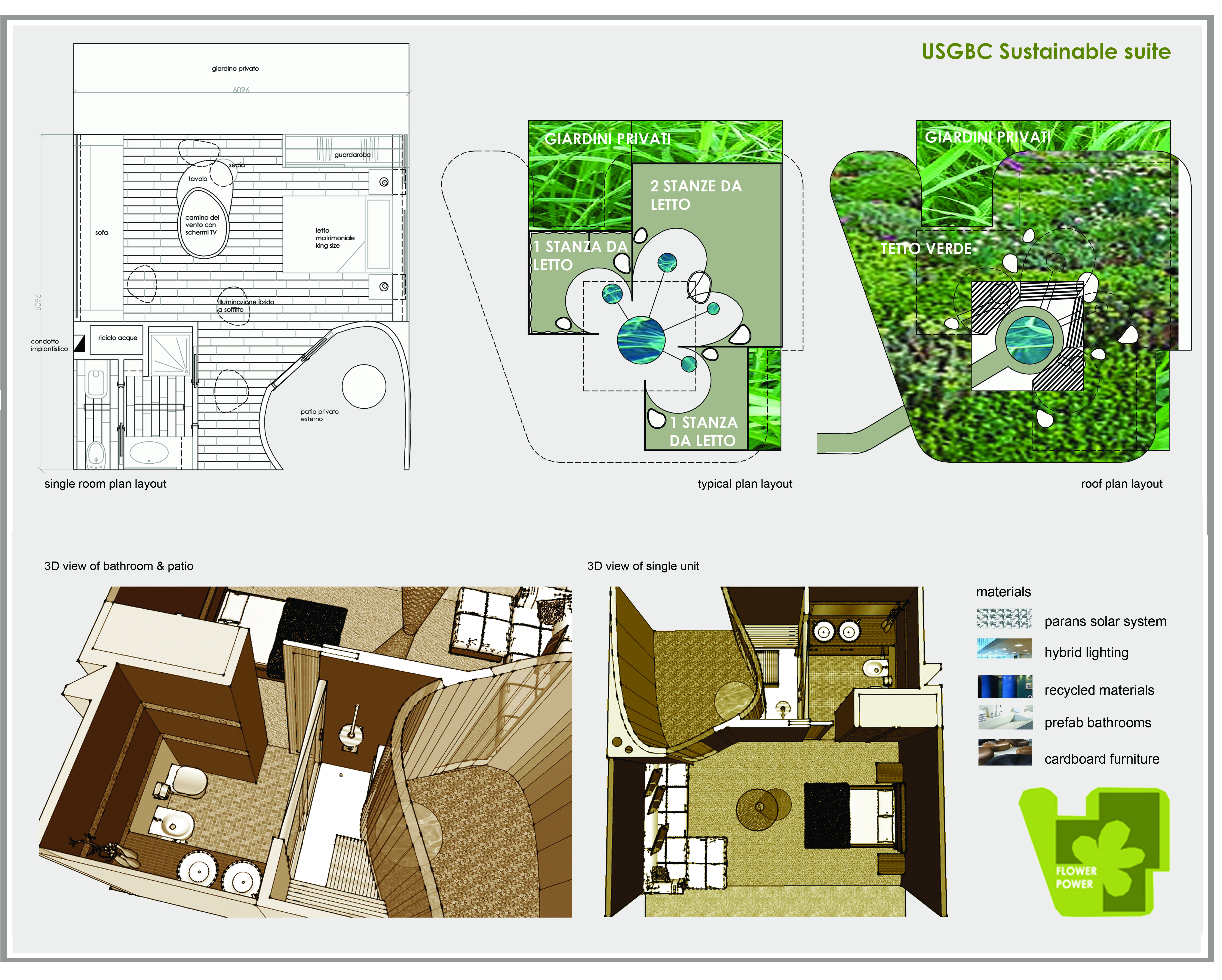 The USGBC – United States Green Building Council - issued a competition to design a sustainable suite for hotels. The main concept of our design was to conceive of a module that would open like a flower and create plan layouts that could be combined with an ideal mix of indoor and outdoor space. In addition to that, the project makes use of sustainable resources such as wind chimneys, solar panels, water recycling and the use of local materials. The aim was also to create a playful colour scheme which could fit well within a Mediterranean or beach setting.